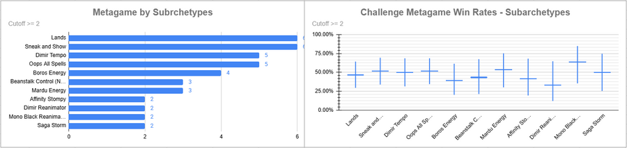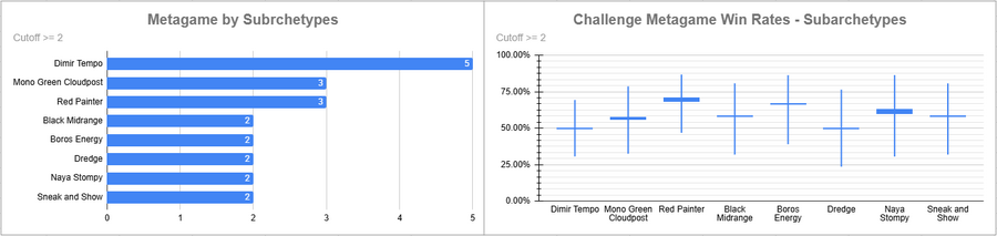 Dimir Tempo was the most played deck, but its overall win rate was right on the medium line. Red Painter did very well here as did Boros Energy and even Naya Stompy.