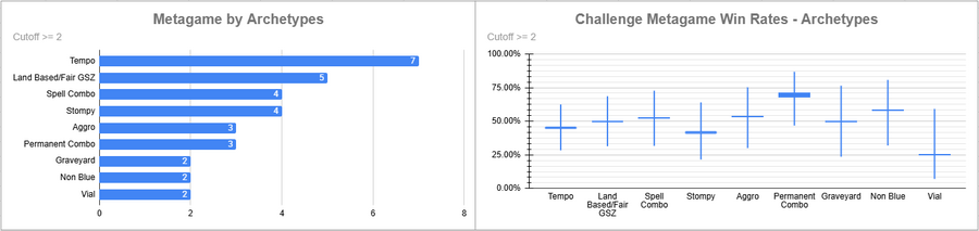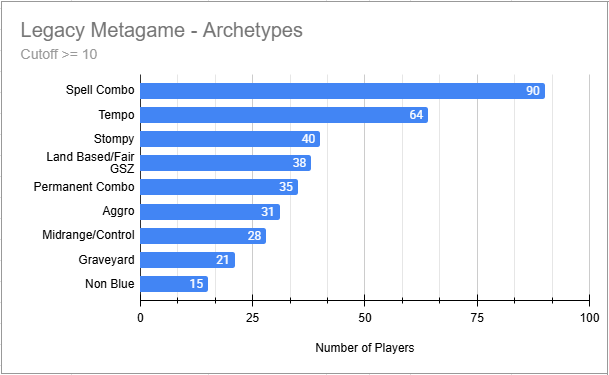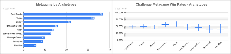 Overall the most popular decks of the entire format from a macro archetype standpoint were Spell Combo based decks, despite how popular certain decks were. Overall Spell Combo made up roughly 24% of the metagame, with Tempo being around 17-18% and below that Stompy and Fair Land Based decks.