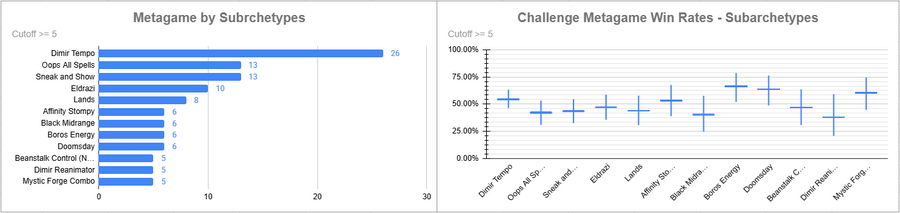 Dimir Tempo was the most played deck of this event, and it had a pretty solid win rate. Boros Energy also had a strong win rate with just six pilots. Oops did rather poorly here, as did Sneak and Show and Lands.