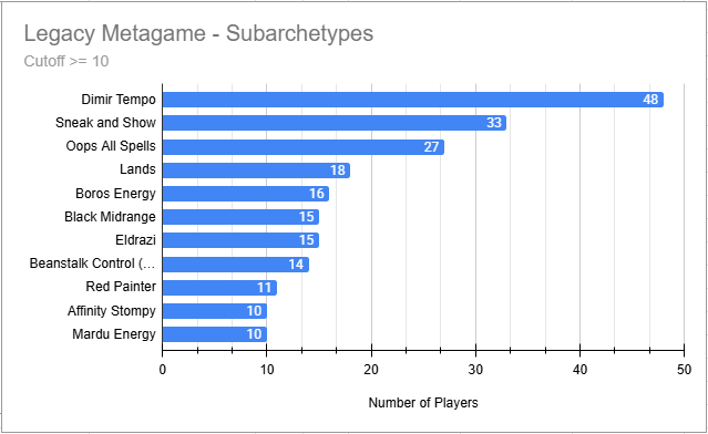 Lands and Sneak & Show were the most popular two decks, with Lands sitting just below 50% and Sneak sitting right above. The real winner here was below the cut-off, our first real look at how much TMNT is affecting Legacy like we discussed earlier in the article.