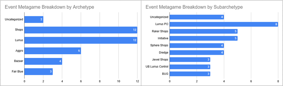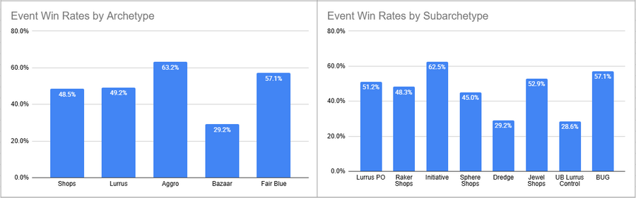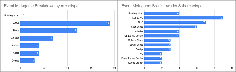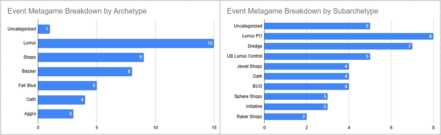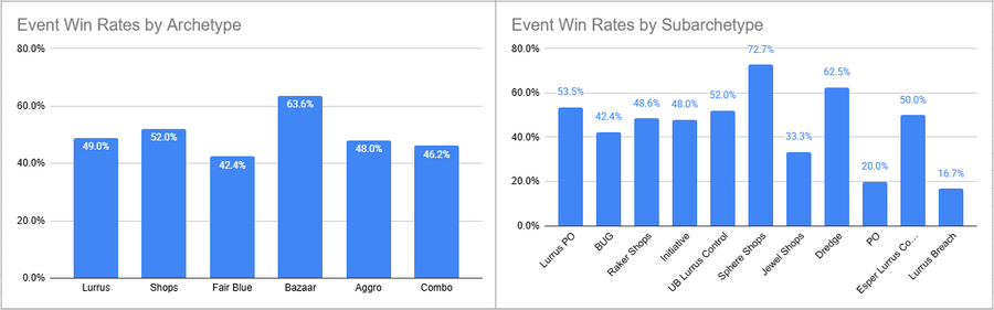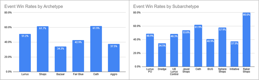 Lurrus PO was the most-played deck of the event, and despite having one Top 8, its overall win rate wasn't too good. Raker had two pilots but one of them did very well in the event so it had a really high win rate. Oath did well here, while Dredge did not.