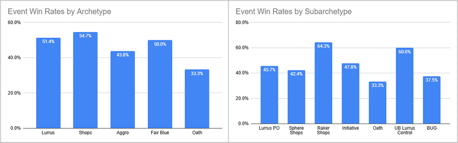 Lurrus PO was the most played deck, and despite two Top 8s its win rate was around 45.7%. Raker Shops looked great here as did Dimir Lurrus. Oath and BUG both had issues here.