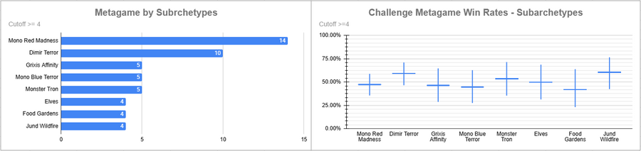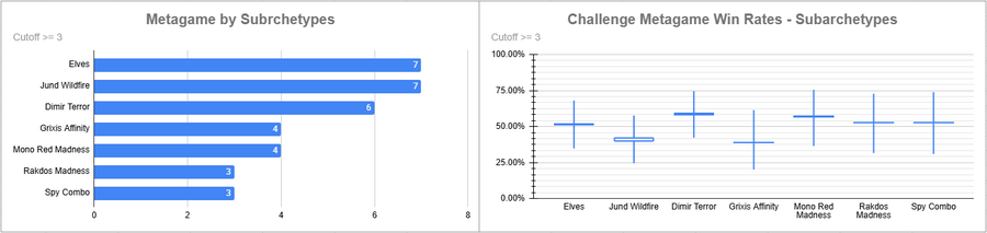 Mono Red Madness was the most played deck of the event, and despite a strong finish its overall win rate was less than 50%. Dimir Terror did very well here, while Grixis Affinity and Mono Blue Terror didn't do too hot.