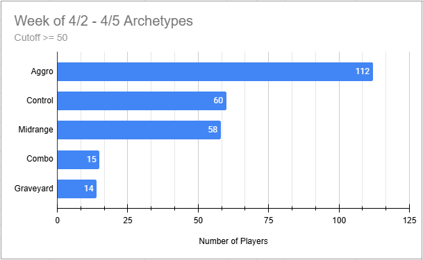This was a pretty normal week with no extra MTGO events, with just around 266 decklist entries total. This tracks because Pauper was not a Premier Play season event until the beginning of Season 2 on MTGO. We'll see the first major addition of this on May 10th with the first Pauper Showcase Challenge of the season.