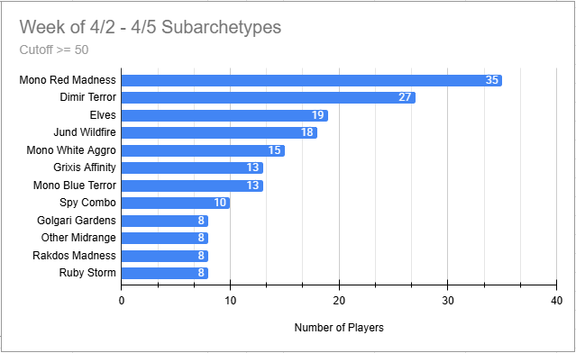 At a solid 35 copies, Mono Red Madness made up the most played deck for the past week, and while the deck had some good individual event results, the overall win rate of the deck wasn't very good at a 46.7% non-mirror win rate. I think this is largely because the deck is so popular that people will just pick it up and try to jam it. It's reasonably cheap enough for an MTGO deck and it can have good results if you really know what you're doing with it, but a lot of people playing it will drag down the win rate because while the deck looks straightforward on the surface, it does have its learning curve and sequencing that really matters.
