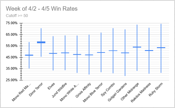 Compare this result with Mono Blue Terror which only had a 49.3% non-mirror win rate here. Granted this is only a weekly result, so sample size is a thing. Whether these results sustain week to week is another thing.