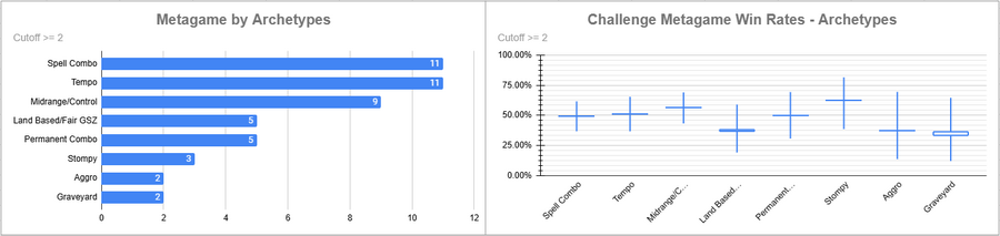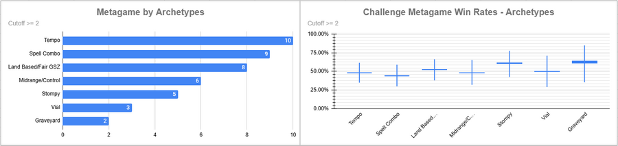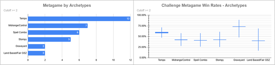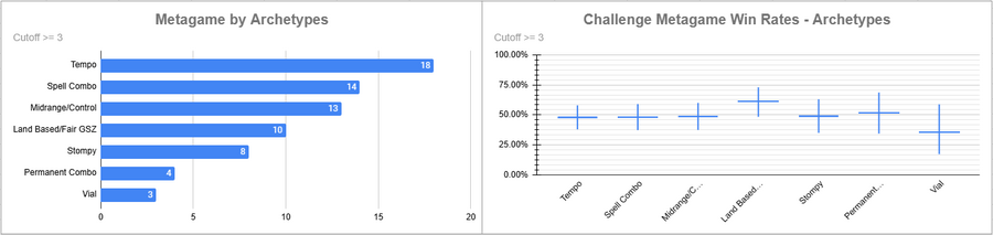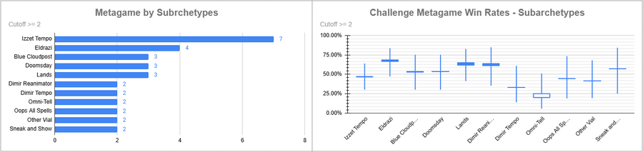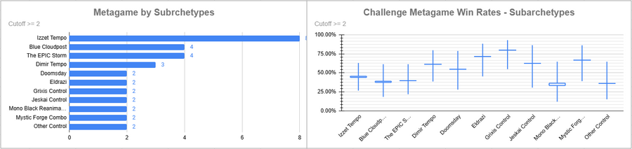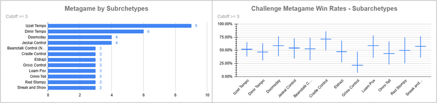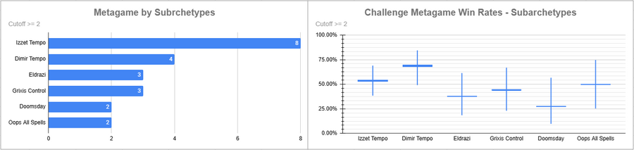 Izzet Tempo was the most played deck and it had a strong win rate here, but Dimir Tempo proved to be the better tempo list in this event. Eldrazi tanked hard and Oops rode the line of 50%.