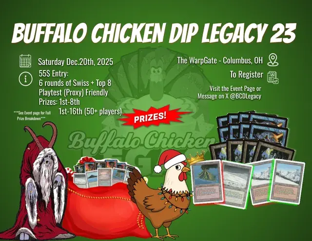 Coming soon on December 20th, 2023 at The Warp Gate in Columbus, OH is yet another Buffalo Chicken Dip event! This event's registration has gone super fast and there's a wait list now, but I keep hearing that maybe the cap will be raised for it from 64 players to a higher cap. All of the details of the event can be found here.