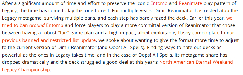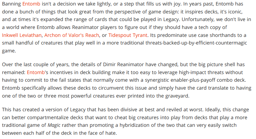 Realistically, hitting something out of the Reanimator shell is what we expected from a BnR, and hitting something structural like Entomb is fine. I don't really believe that the card was an actual pillar of Legacy. The card that felt more like a pillar in this shell was always Reanimate to me, and Entomb is a card that previously had been banned, so it's totally fine for me to get rid of it.