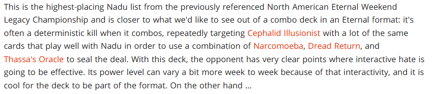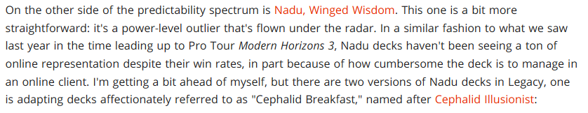 It is fair to note that Nadu's largest presence in Legacy had to do with its presence in Cephalid Breakfast and that Nadu was very good in that deck, but the article goes on to talk about "Nadu Midrange".