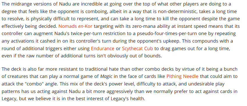 The issue here is that Nadu is problematic because it requires a significant amount of time and presents challenges in physically representing the game state. As someone who thinks Nadu has been relatively fine for Legacy power-level wise, I do understand that if that's not what they want in the format, it's fine to get rid of it. It's a strange consideration, though when you think about how poorly most of the Nadu builds like Cradle and Midrange actually were doing data-wise. Even Cephalid Breakfast had a sub 50% win rate, but some really strong pilots who helped define it. This feels much more of a play pattern ban than anything, and people definitely didn't like Nadu at all, so I get it. I don't much like it but I get it.