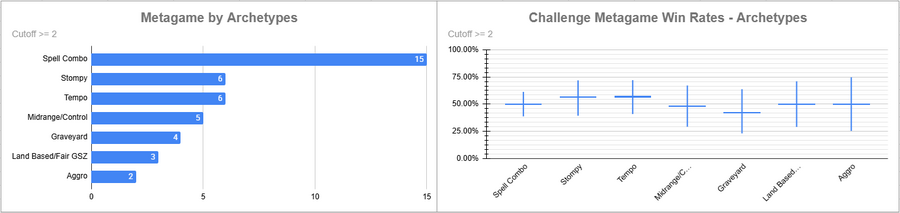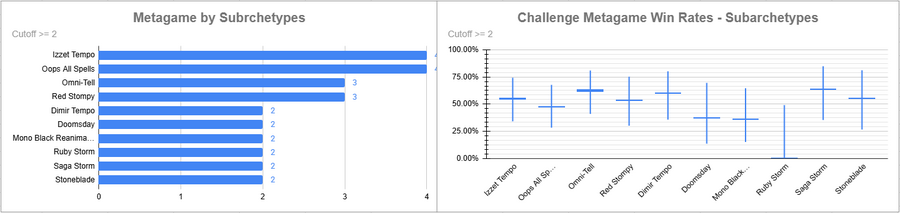 Both Izzet and Oops were tied for most played, but Izzet had a good win rate and Oops' was just below 50%. Omni-Tell looked very good, as did Saga Storm.
