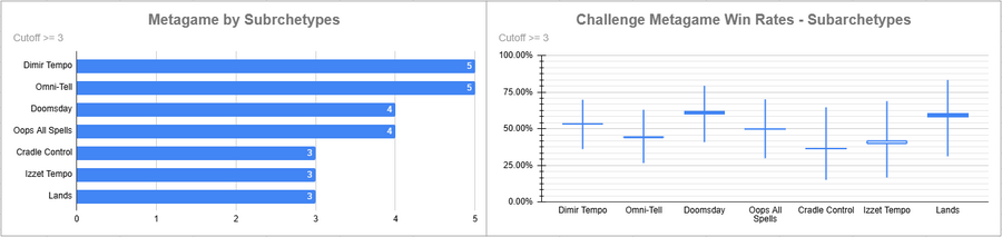 Dimir and Omni-Tell were the most played, and both had Top 8 appearances but Omni's overall was lower than 50%. Doomsday and Lands both did very well.