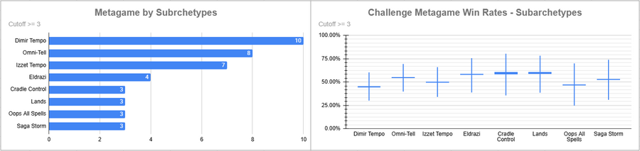 Dimir Tempo was heavily played, but its overall win rate wasn't very good. Cradle Control, Lands, and Eldrazi all looked good.