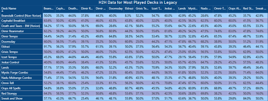 Since we're still looking at data on a weekly basis, let's look at this week's updated H2H data. This is sourced from the Legacy Data Collection's crowdsourced data, fed through into PowerBI (still working out a place to host this).