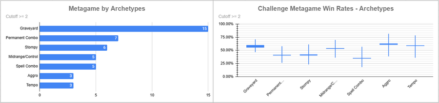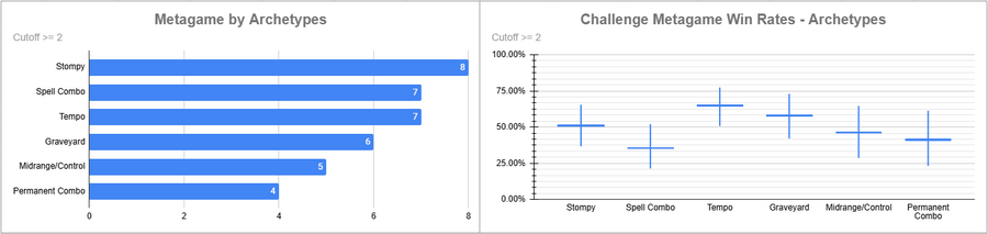 Dimir Reanimator was heavily played in this event, and its win rate was very good overall. Red Stompy sat in the 50% middle of the lane. Izzet Tempo looked good here, too.