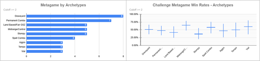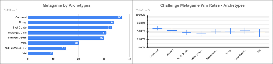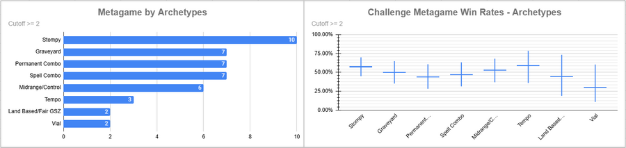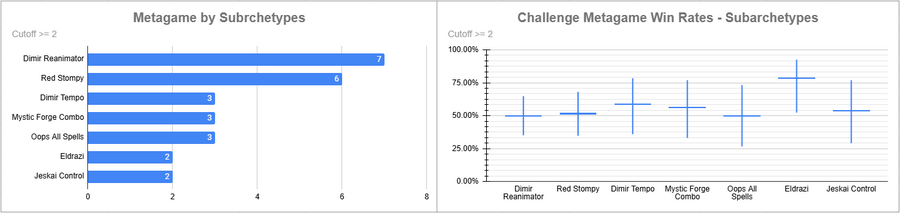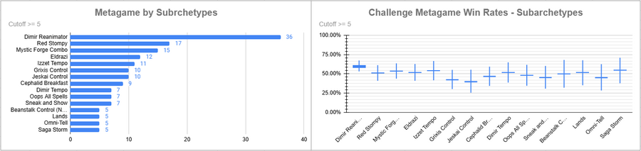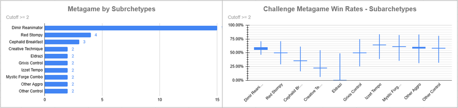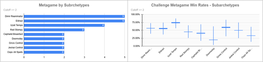 Both Dimir Reanimator and Eldrazi tied for most played, and both had good win rates. Izzet Tempo looked great, as did Grixis Control.