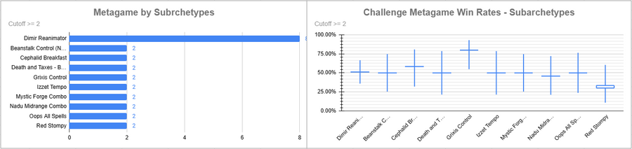 Dimir Reanimator was heavily played over the other decks, and it had a middling win rate but had three Top 8 appearances. Grixis Control looked super good here, as did Cephalid Breakfast.