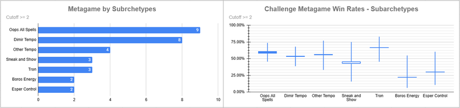 Oops was the most played deck of the event this week, and its win rate was quite good at a 60.47% non-mirror win rate. Tron also did extremely well. Sneak and Show and Boros Energy performed rather poorly.
