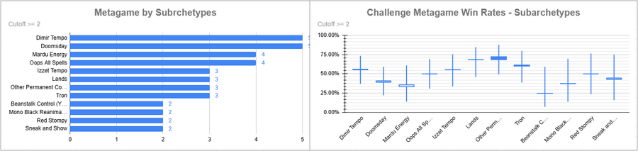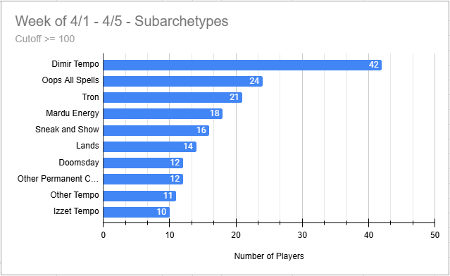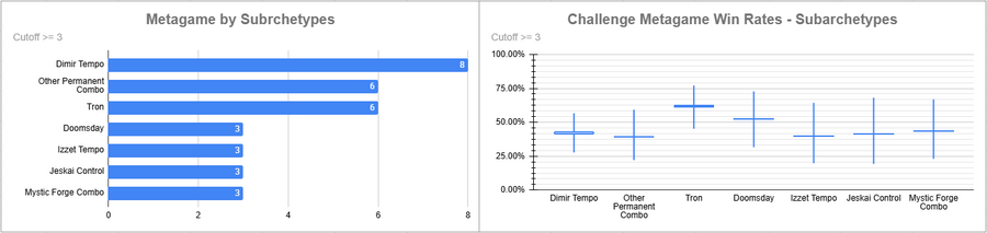 Dimir Tempo was the most played deck of the event, but its overall win rate was not that great. Tron did very well here, as did Doomsday.