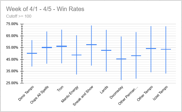 Both Dimir Tempo and Doomsday were well played here, with Dimir having a good win rate and Doomsday not doing so well. Lands did very well too.