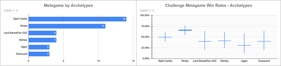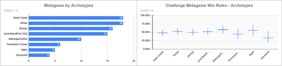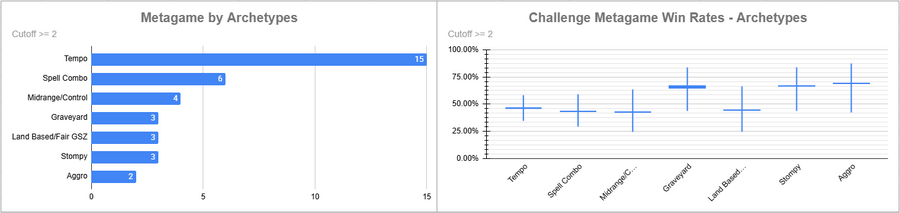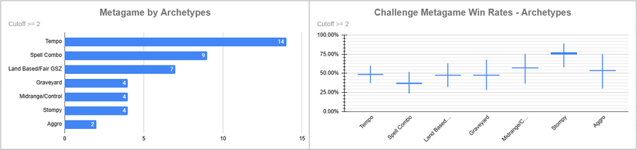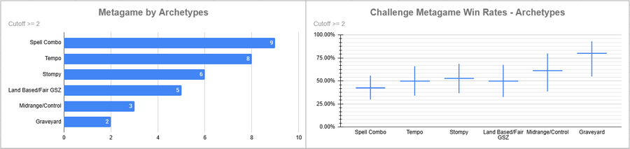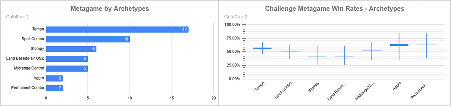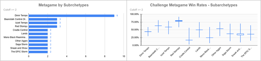 Dimir Tempo was again the most popular deck, but its overall win rate was rather low. Red Stompy did extremely well here, while the rest of the decks above the cutoff either overperformed (Beans/Izzet) or underperformed massively.