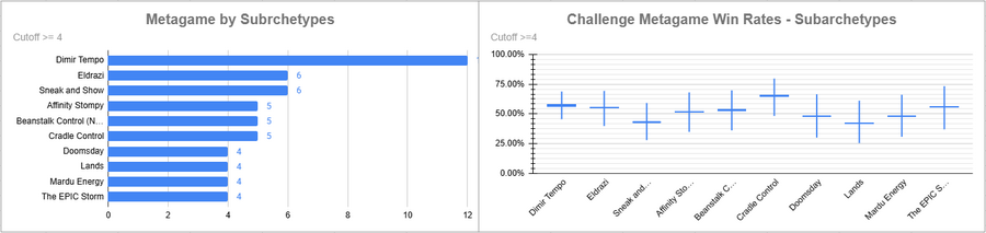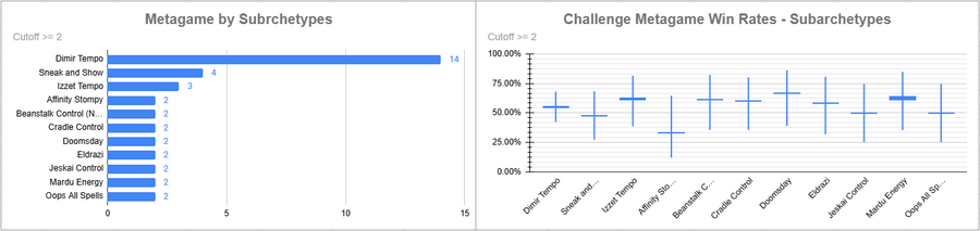 Dimir Tempo was the most played deck, and it had a pretty good win rate. Izzet had a really strong win rate here, as did Oops. Doomsday rode the 50% line while Mardu Energy performed poorly.