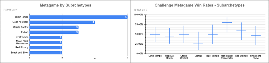 Dimir Tempo was the most played deck but its win rate sat right in the middle. Mono Black Reanimator looked very good here, as did Red Stompy. Oops had a very mid win rate at around 45% non-mirror.