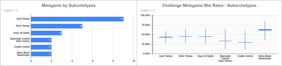 Izzet Tempo was the most played deck of this event and despite a Top 8 its overall win rate was below 50%. Dimir and Oops also sat below 50% despite the latter having a Top 8 appearance too. Mono Black Reanimator looked pretty good here.