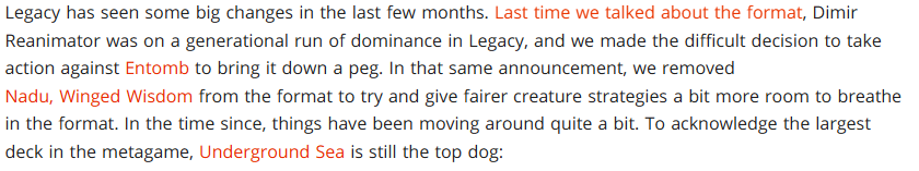 From an informational standpoint, it is correct that Underground Sea is a top dog in Legacy, and that Dimir Tempo is one of the format's most popular decks. It also happens to predominantly be one of the format's best Tamiyo decks, but Tamiyo herself tends to just be good across the format (something that really isn't noted here in the impact that card actually has on the format) in just about any deck she's in. It calls out Dimir Tempo as "public enemy number one", a statement which I don't fully buy into. Yes, Dimir Tempo is popular, and you do need to have a plan for Tempo decks in general (most of which is just understanding what is important in the matchup, what your role is, and what exploits their game plan) but I don't specifically believe just Dimir Tempo is the most played deck in the format does it truly make it a "public enemy number one", especially since Izzet Tempo is nearly just as popular. I think it's agreeable to say Tempo in general is "public enemy number one", but that's realistically always been Legacy for a long time.