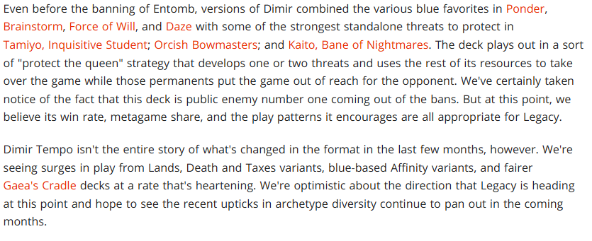 What we saw happen after the bannings was decks like Omni-Tell, Sneak and Show, Oops, Doomsday. These decks have all taken a slice of the pie and they all seem to be doing rather well despite how prominent Dimir Tempo is (a deck that for many of these decks is a fairly poor matchup overall) and I think that is largely because Dimir's prominence has brought up decks that are generally good vs Dimir but are also fair decks, and the combo decks prey on those other decks and then hope to outskill or dodge the Dimir matchup. Some of these decks the issue only gets worse if they play red due to the increasing play rate of things like Hexing Squelcher. I don't fully expect these statements to be totally up to date though. I have to believe this was written before Squelcher was released, which is fine. It's the complete omission overall of no discussion of Combo, when it seems to be such a big portion of the current Legacy format, which seems strange to me.