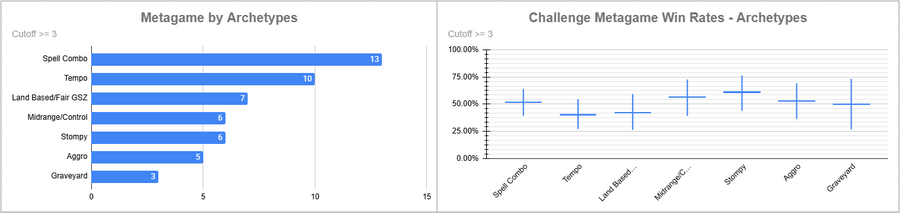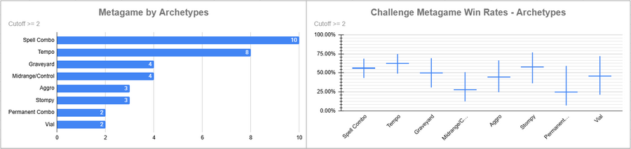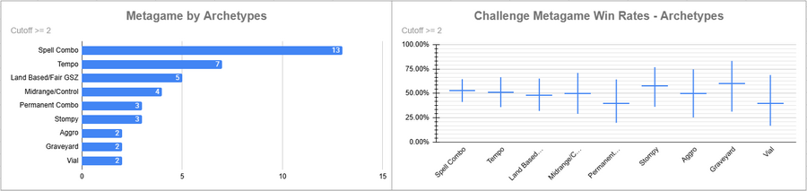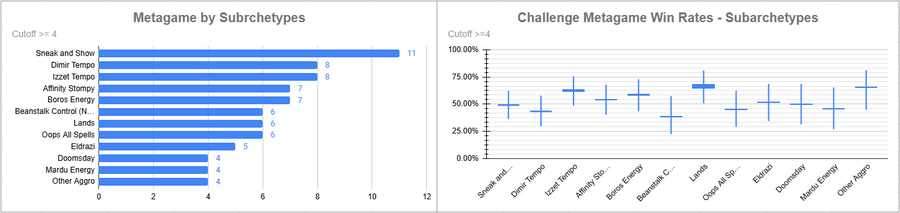 Sneak and Show was the most played deck of the event, but its overall win rate was pretty medium. Dimir and Izzet tied for metagame, but Izzet performed way better. Lands also performed very well. Oops did not do well here.