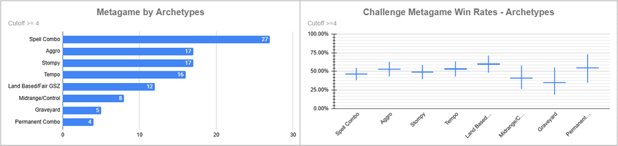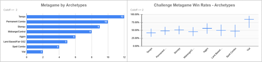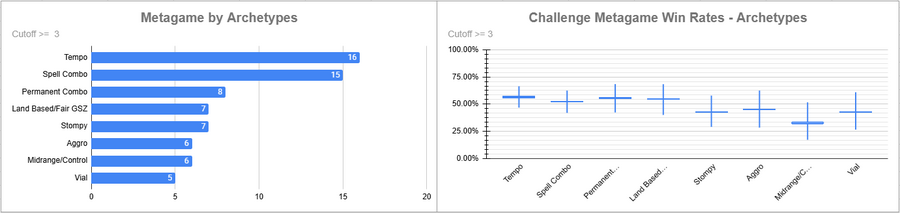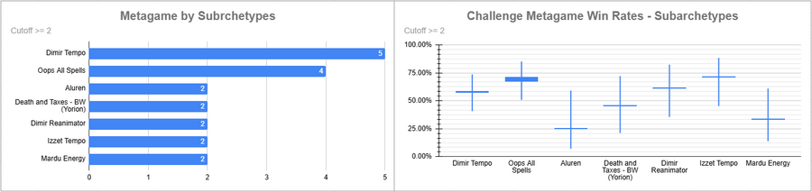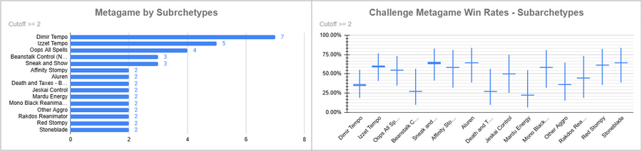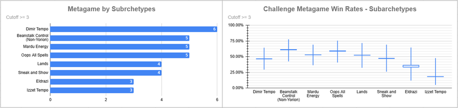 Dimir Tempo was the most played deck of the event, and it had a good win rate. Oops did very well here, as did Izzet.