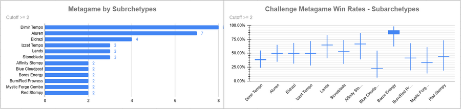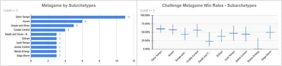 Dimir Tempo was the most played deck of the event, and it had a strong win rate. Aluren did very well, as did Cradle Control.