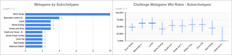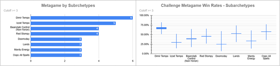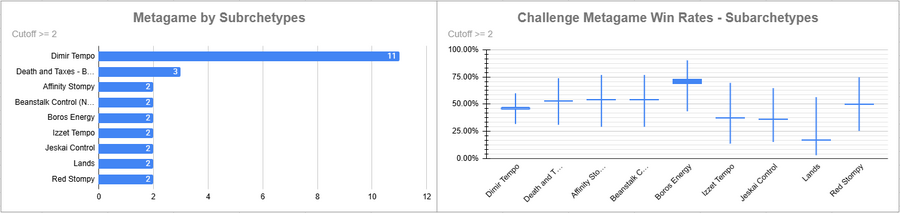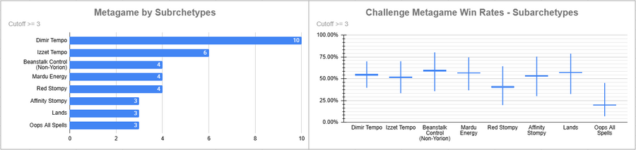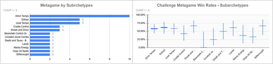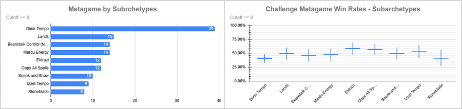 Dimir Tempo was the most played deck (AGAIN?! IN THIS ECONOMY?!) and it had a solid win rate. Eldrazi also did very well, as did Sneak and Show. Beans did rather poorly, as did decks like Mardu and Oops.