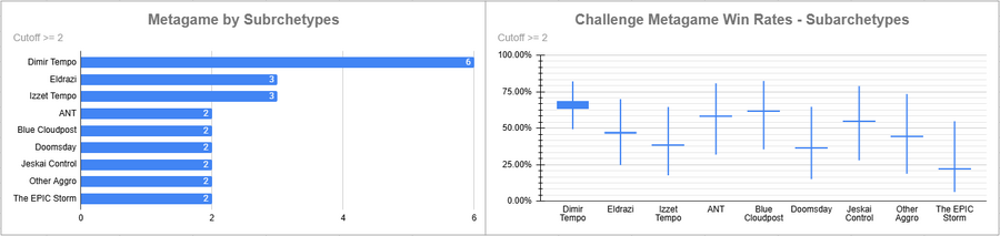 Dimir Tempo saw a lot of play here, and it did very well overall in the event with a 67.86% non-mirror win rate. ANT, Blue Post, and Jeskai all did fairly well. Izzet Tempo did not do well, nor did Doomsday.