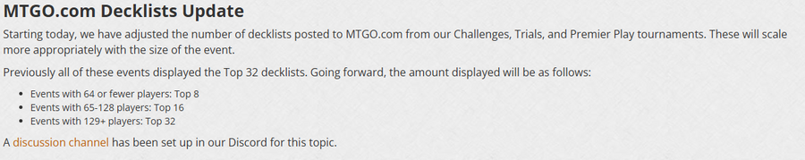 I posted a video the day this was release about this, and I'll embed this at the end of the section here, but this is definitely firmly an action I believe was taken due to influence by Wizards of the Coast. Daybreak Games has in the past been incredibly supportive of data and decklist data, and while there's no reason given in the article, it doesn't take much to read between the lines to note that Wizards has always been notoriously anti-data. This is an absolutely frustrating thing to see, and I implore Wizards to consider rolling back this change back to the way things were. While it would be nice to have more data than we had, we probably aren't getting that (after what happened the last time we had all the data), so the bare minimum here is to put things back the way it was before.