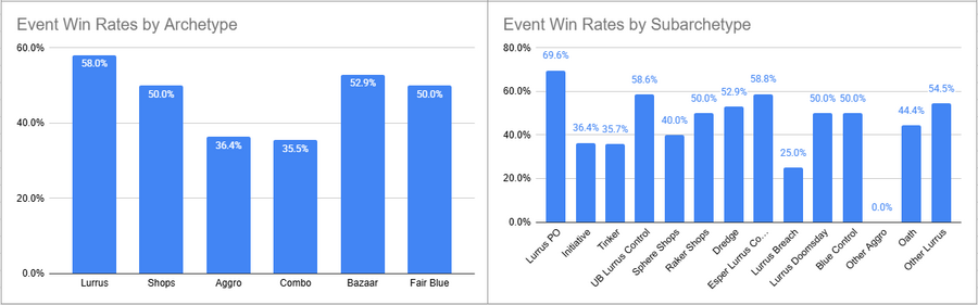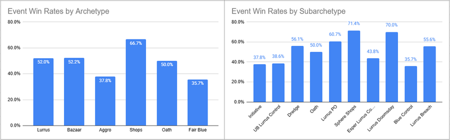 Both Initiative and Dimir Lurrus were heavily played here, but both decks had win rates below 40%. Dredge looked great, as did Sphere Shops and Lurrus Doomsday.