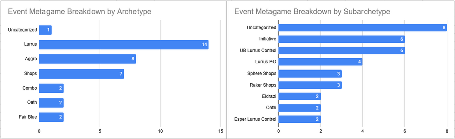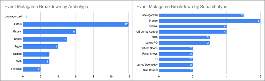 Dredge was the most played deck of the event, but despite a Top 8 appearance, its win rate was less than 50%. Dimir Lurrus and Lurrus PO both did very well, as did Sphere Shops.