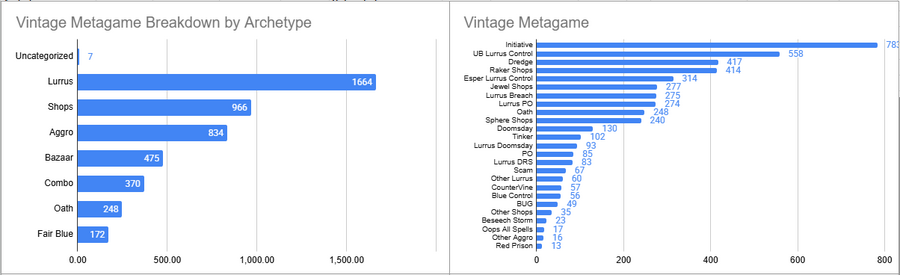 It's been a minute since we last looked at how Vintage is going metagame-wise (since November), so I figured this was a good time to take a look and see how Vintage is shaping up. We're leaning on the MTGO Vintage Discord's data collection efforts here, with the latest aggregate data sheet linked here. This is looking at the time period when Tezzeret, Cruel Captain was released to now.