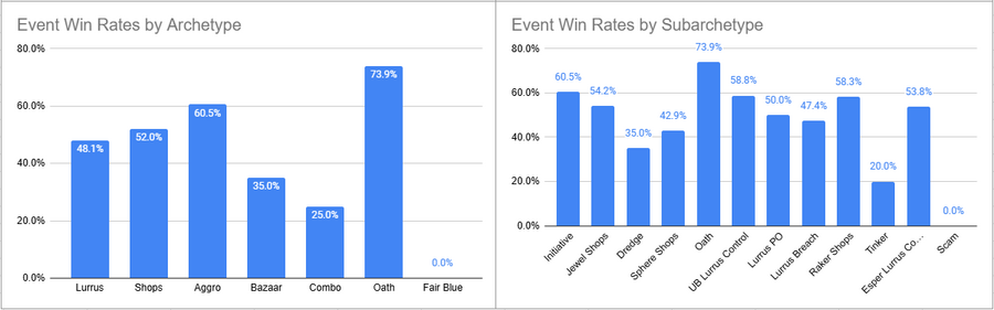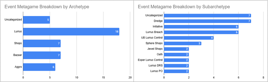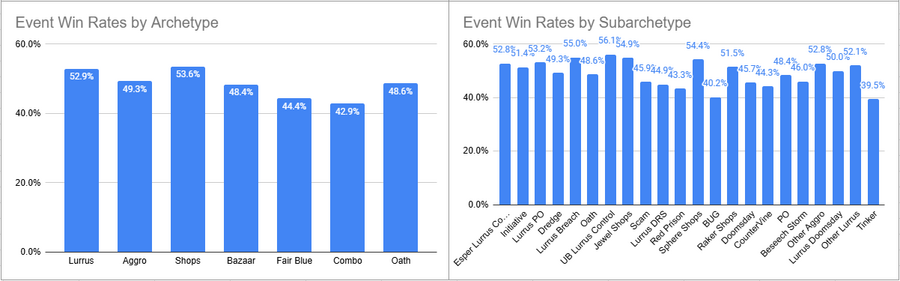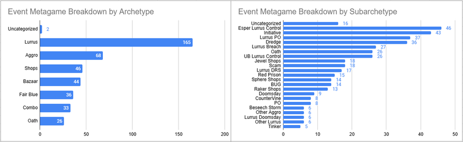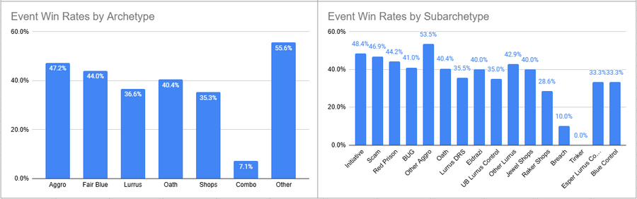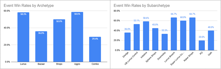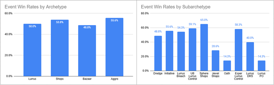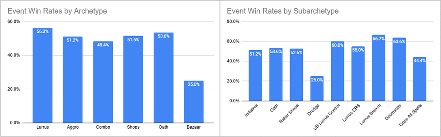 Both Dredge and Dimir Lurrus were the most popular decks. Dredge did not do very well at all, while Dimir had a solid-looking win rate. Lurrus Breach, Esper Lurrus, and Raker Shops all did very well. Doomsday and PO/Oath did poorly.