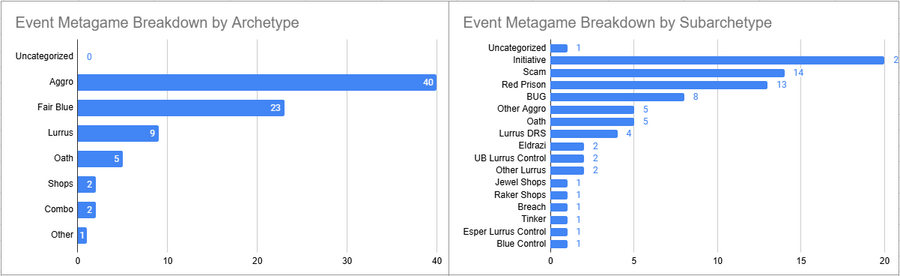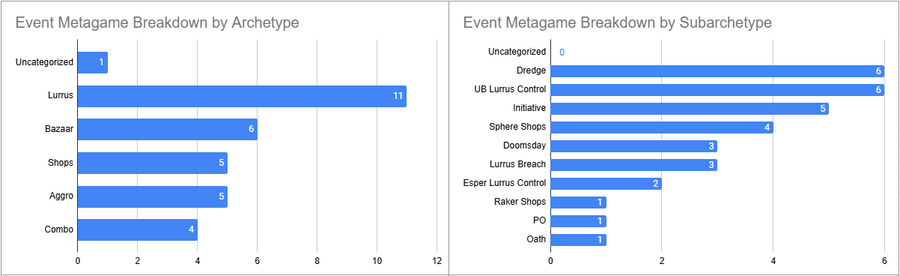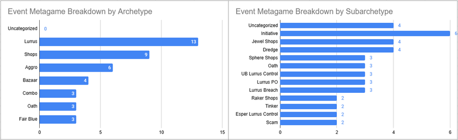 Initiative was the most played deck of the event, and it had a pretty good win rate. Oath did very well here, as did Dimir Lurrus and Raker Shops. Dredge did very poorly as did Sphere Shops.