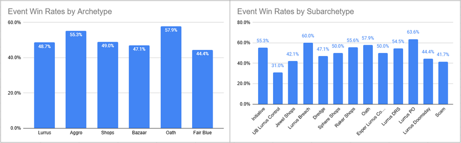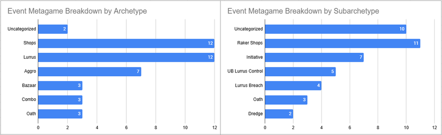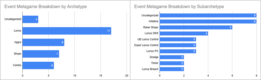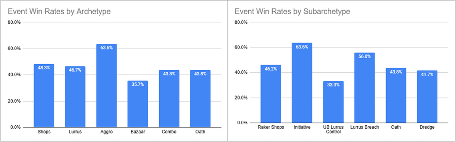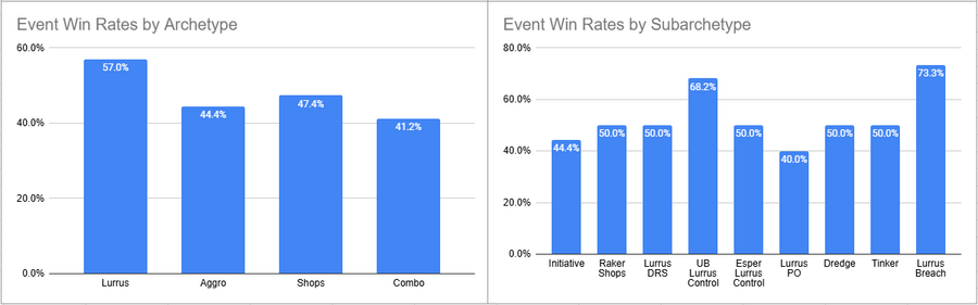 Raker Shops was the most played deck of the event and despite a Top 8 it had a pretty sub 50% win rate. Initiative looked great here, as did Lurrus Breach. Dimir Lurrus utterly tanked it here in terms of win rate.