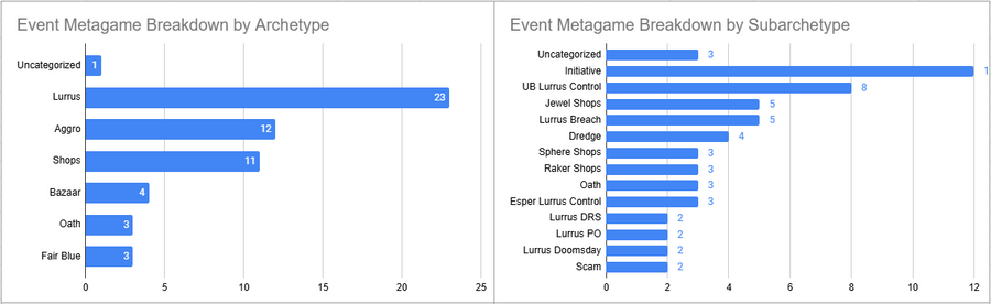 Initiative was the most played deck and despite having two Top 8s it had a less than 50% win rate. Lurrus Breach did very well too, and Dimir Lurrus also did very good.