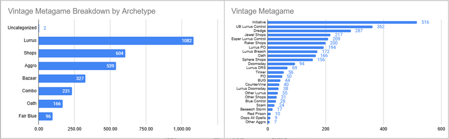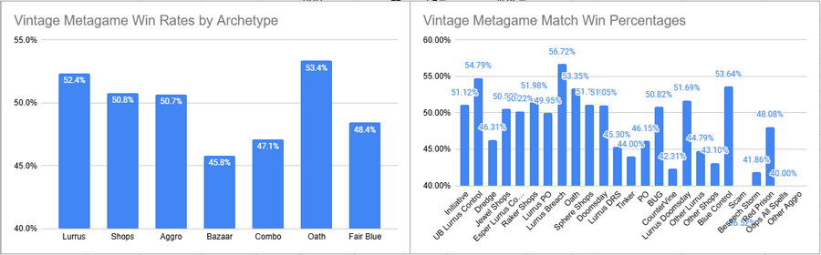 Overall though, Vintage does look like it's in a pretty healthy spot. There's a plethora of different decks within the Lurrus umbrella to play, but also a variety of pillar decks within the Shops area to also look at, but then decks like Oath and Doomsday also continue to have solid representation and win rates. If there's any big loser in the current metagame it's definitely the Bazaar strategies. Dredge is popular but its win rate is very poor and that doesn't help the overall aspect of Bazaar decks.