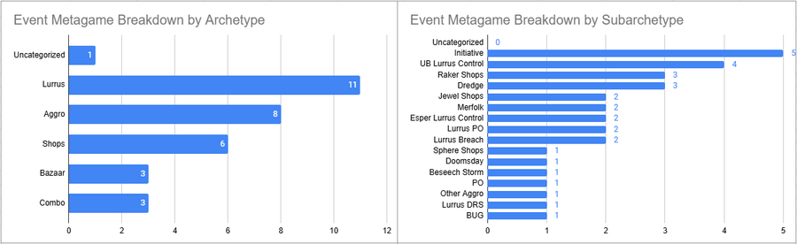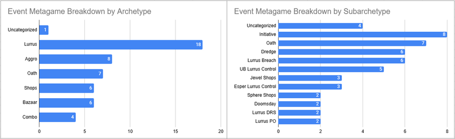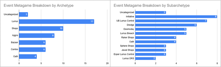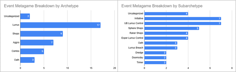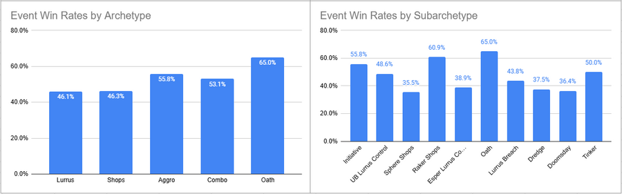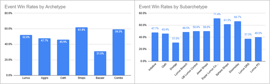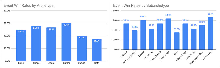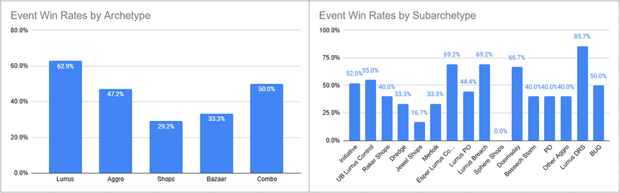 Initiative was the most played deck of the event here, but its overall win rate was less than 50%. Esper Lurrus, Doomsday, and Sphere Shops all looked pretty good here.